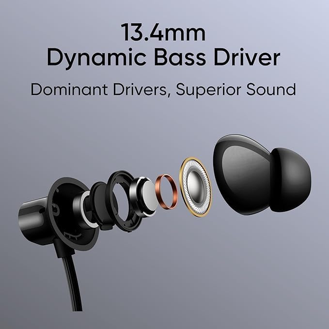 Equipped with a 13.4 mm dynamic bass driver, this neckband produces deep bass, clear mids, and crisp highs for an enjoyable listening experience throughout the day.